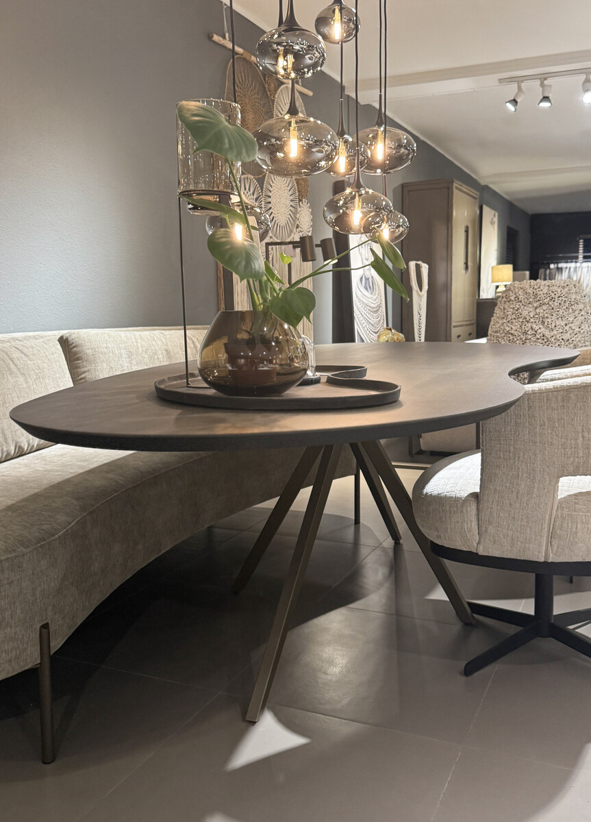 Eetkamertafel Beau is een ovale tafel met een naar binnen lopende rand en ronde hoeken.